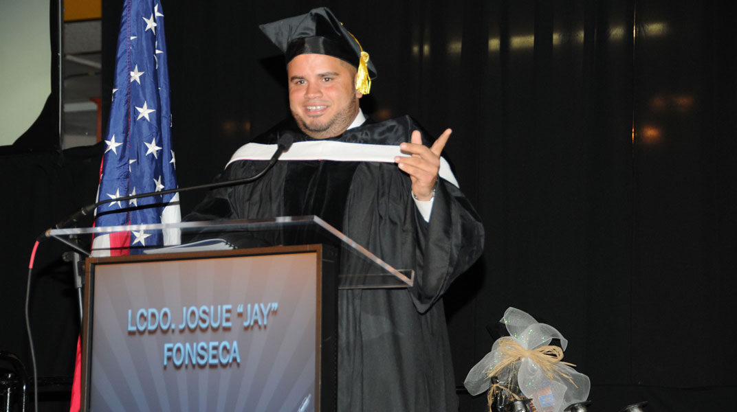 Los graduandos y sus familiares e invitados recibieron las felicitaciones y consejos del Honorable William Miranda Torres, Alcalde del Municipio Autónomo de Caguas. Sin desaprovechar un micrófono abierto, Jay Fonseca le lanzó una “puyita” acerca del impuesto de valor añadido (IVA) al alcalde Miranda Torres, quien fuera uno de los invitados especiales, al recordar que Caguas fue el primer Municipio en comenzar el cobro de impuestos sobre las ventas.  Luego, en un discurso donde demostró su franco carácter, entre broma y seriedad, se dirigió a los graduandos para exhortarles a que ejercieran su profesión con excelencia, a trabajar en equipo ayudándonos unos a otros y a que no olvidaran que “el éxito lo pueden obtener independientemente de dónde se encuentren”.